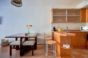 Das klimatisierte Apartment verfügt über zwei Schlafzimmer mit insgesamt drei Betten, ein eigenes Badezimmer sowie eine voll ausgestattete Küche mit Kochnische und kompletter Küchenausstattung. Zur weiteren Ausstattung zählen Heizung, eine Waschmaschine sowie ein Balkon mit angenehmer Aussicht.