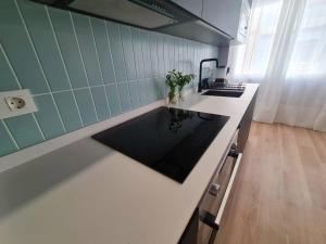 Die voll ausgestattete Küche umfasst moderne Geräte wie Backofen, Mikrowelle, Kühlschrank, Kaffeemaschine, Wasserkocher und Toaster sowie Küchenutensilien und einen Esstisch. Zur weiteren Ausstattung gehören Klimaanlage, Heizung, Sitzbereich mit Schlafsofa und Flachbild-TV sowie Kleiderschrank, Bügeleisen/-brett und Waschmaschine.