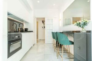 Die voll ausgestattete Küche ist modern eingerichtet und umfasst Kochfeld, Kühlschrank, Backofen, Mikrowelle sowie Kaffeemaschine und Teezubereitungsmöglichkeiten. Ein Esstisch sorgt für komfortable Mahlzeiten.