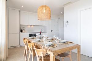 Accommodation features two separate bedrooms furnished with three beds in total, alongside two private bathrooms. The fully equipped kitchen allows for convenient meal preparation, complemented by air conditioning throughout the apartment and a flat-screen TV for entertainment.