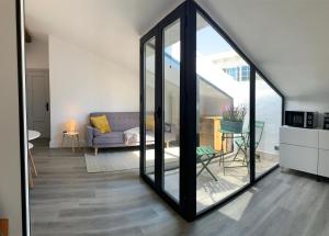 Inside, the apartment offers one separate bedroom alongside a living room furnished with a sofa bed and seating area on hardwood flooring. The fully equipped kitchen features modern appliances including a refrigerator, dishwasher, microwave, coffee machine and tea and coffee making facilities complemented by kitchenware and a dining table. Additional conveniences include ironing facilities with iron and board, wardrobe space, towels, linens, washing machine and clothes drying rack.