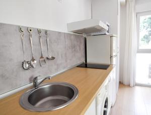 Die klimatisierte Unterkunft verfügt über ein Schlafzimmer mit Parkettboden und allergikerfreundlichen Kissen ohne Federn. Das private Badezimmer ist mit Dusche, Haartrockner sowie Shampoo und Duschgel ausgestattet. Die voll ausgestattete Küche umfasst einen Kühlschrank sowie eine Kochnische einschließlich Küchenutensilien und Esstisch. Weitere Ausstattungsmerkmale sind Heizung, Wäscheständer, Waschmaschine, Sitzbereich mit Sofa sowie ein Flachbildfernseher.