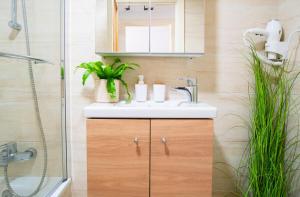 Inside the apartment, guests will find a fully equipped kitchen suitable for cooking and food storage as well as an air-conditioned living space that includes a sofa bed. The unit features one private bathroom along with additional conveniences such as a washing machine and a flat-screen TV.