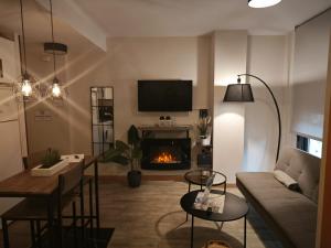 The accommodation comprises a separate bedroom with one bed, a living area with a fireplace, and one bathroom equipped with complimentary toiletries including body soap and a hairdryer. Guests can enjoy kitchen amenities like a full kitchen with microwave, stovetop, refrigerator, coffee machine, electric kettle, toaster as well as tea and coffee making facilities. Additional in-room features include soundproofed walls, parquet flooring, air conditioning heating options, an iron with ironing board, wardrobe closet space and towels.