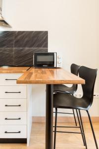 Dieses stilvolle Loft verfügt über eine komplett ausgestattete Küche mit Herdplatte, Backofen, Mikrowelle, Kühlschrank, Toaster, Kaffeemaschine, Wasserkocher sowie sämtlichem erforderlichen Kochgeschirr. Im Studio befindet sich ein Bett, die individuell regulierbare Klimaanlage sorgt für Komfort. Weitere Ausstattungsmerkmale sind eine Schlafcouch im Sitzecke-Bereich mit Fliesenboden sowie praktische Extras wie Bügeleisen, Kleiderschrank bzw. Garderobe, Wäscheständer und Waschmaschine.